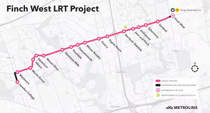 The line will run along Finch Avenue W., primarily above ground, with 18 stops from Humber College's North Campus to Finch West, where it connects with Line 1.