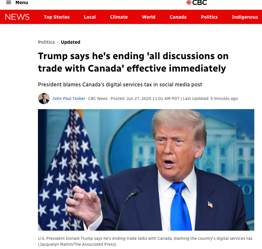 "We have just been informed that Canada, a very difficult Country to TRADE with, including the fact that they have charged our Farmers as much as 400% Tariffs, for years, on Dairy Products, has just announced that they are putting a Digital Services Tax on our American Technology Companies, which is a direct and blatant attack on our Country," Trump said.